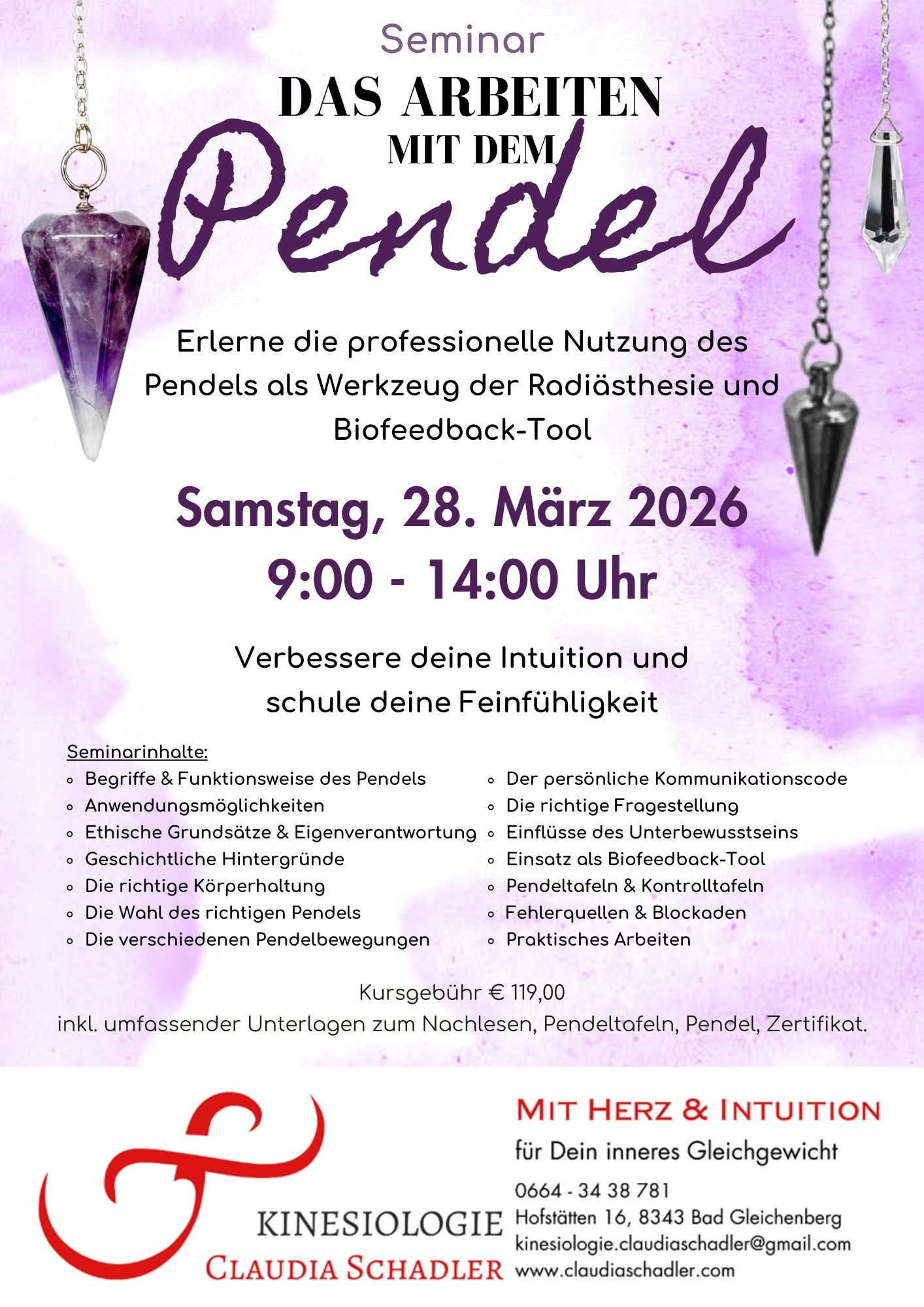 Beim Seminar verrate ich Ihnen wie Sie sich auf Ihr Pendel einschwingen, zeige Ihnen die richtige Körperhaltung bei der Anwendung und informiere Sie über die verschiedensten Pendelarten sowie über Alternativen.